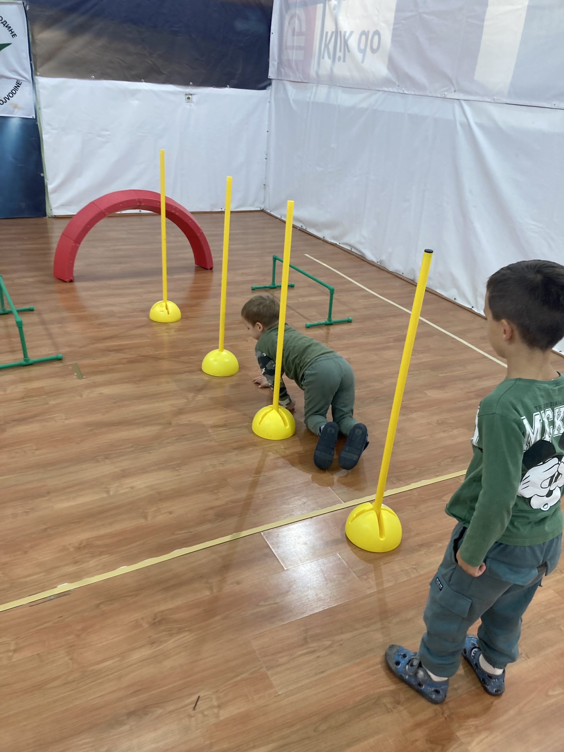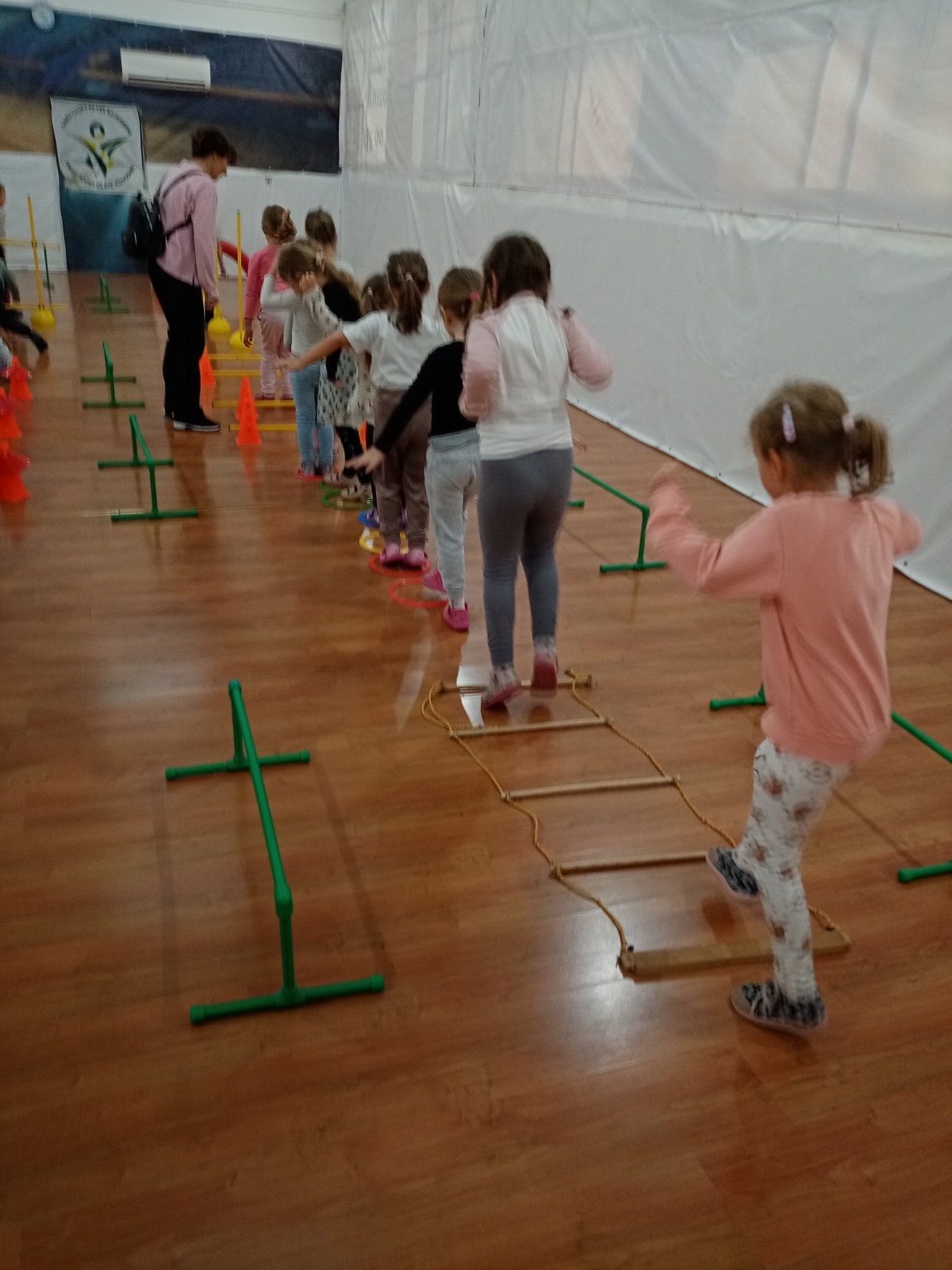 Две старије и једна средња група са својим васпитачима Вером Јуришић, Магдаленом Перић, Лепом Французевић, Тиханом Рађен, Татјаном Опачић и Маријом Стевовић су у оквиру Дечије недеље посетиле Спортску дворану „Пезос“. Тамо их је дочекао тренер који је за њих припремио занимљиве и прилагођене вежбе. Деца су се загревала, трчала, скакала и пролазила полигон спретности. Сви су се трудили да буду активни и да прате упутства тренера. Васпитачи су подржавали децу и бодрили их током целе активности. Вежбање је протекло у веселој атмосфери, а деца су уживала у дружењу и покрету.