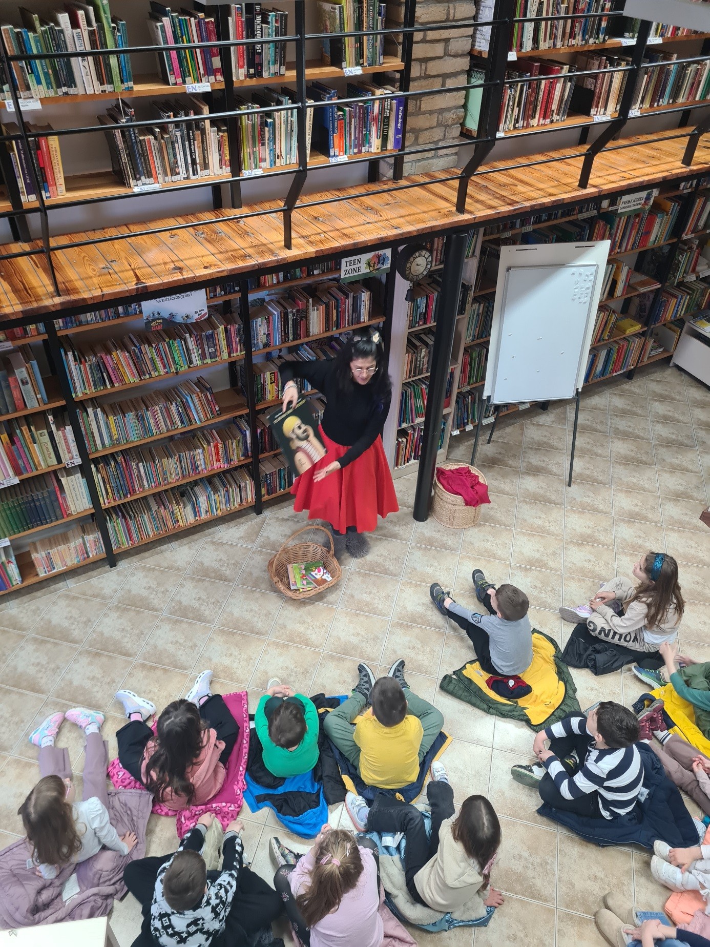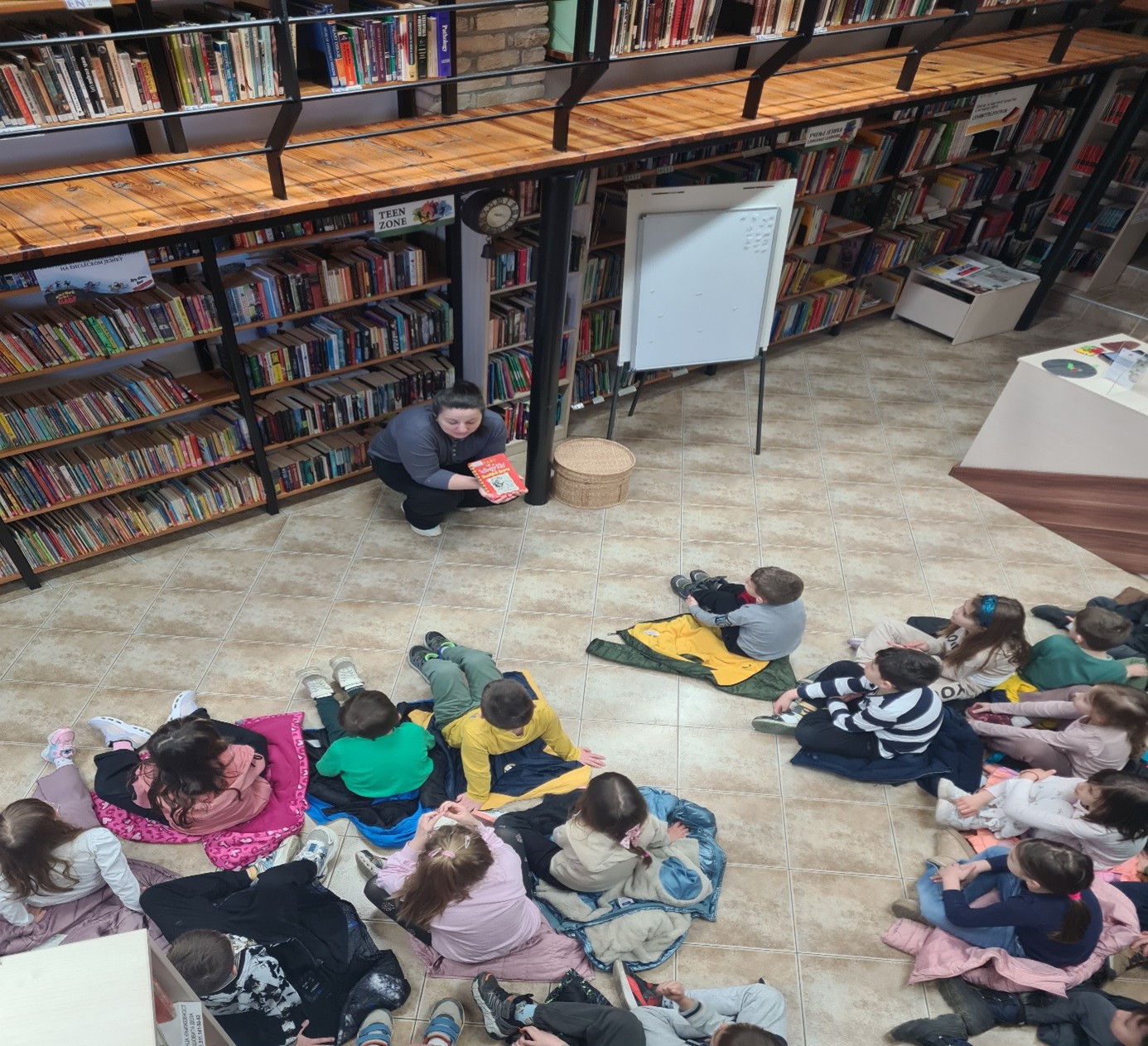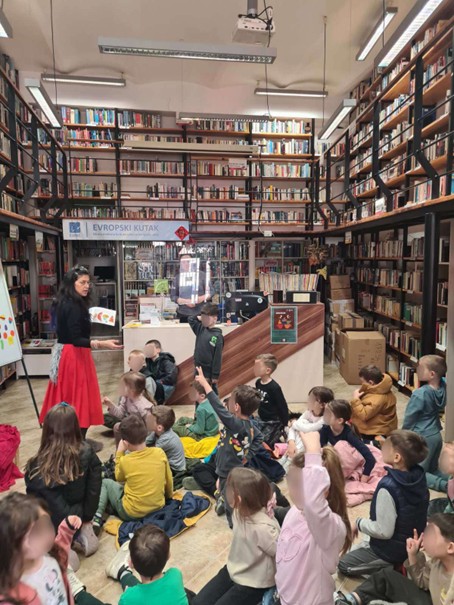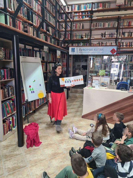 Деца из групе пред полазак у школу су са васпитачима Тамаром Грмушом и Стеваном Јордановским посетила ,,Полиглотско ћоше“, огранак Градске библиотеке у Новом Саду, са књигама искључиво на страним језицима. Радионицу приповедања прича на енглеском језику (Storytelling) водила је Lorena Abud .Instantes, професионални приповедач. Лорена је деци на енглеском језику дочарала разнолике приче уз помоћ интерактивне методе, а деца су учествовала у приповедању вербално, мимиком, покретима и звуком….Радионици су присуствовалa и деца пред полазак у школу из мешовите групе вртића ,,Срна“ код васпитача Сање Радовић и Марије Мркеле.