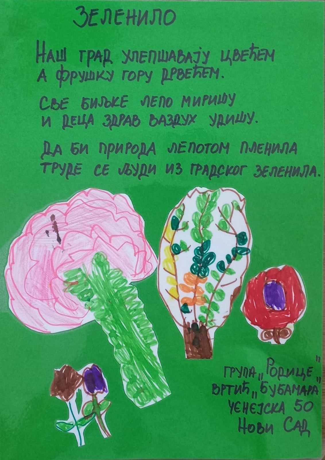 Тим поводом, проширили су своја знања о разноврсности биљака које успевају на нашем подручју, као и о условима који су важни за њихов раст. Деца су за ту прилику са васпитачицама Недељком Трифковић и Владиславом Вучић нацртала и поклонила запосленима заједнички рад, на шта су они узвратили богатим поклонима, те децу даривали са по једним цветом у саксији, који ће засадити код куће са родитељима.