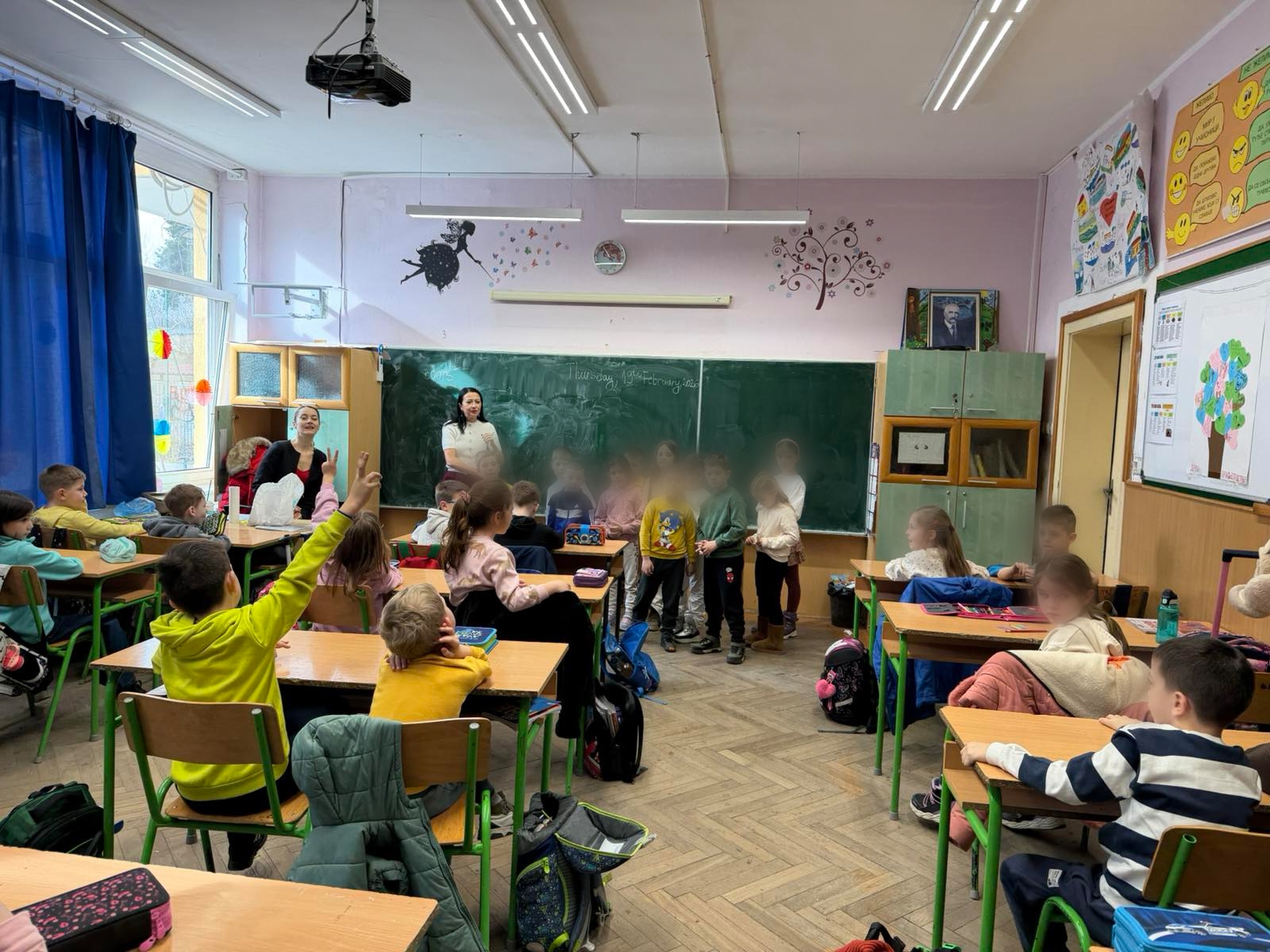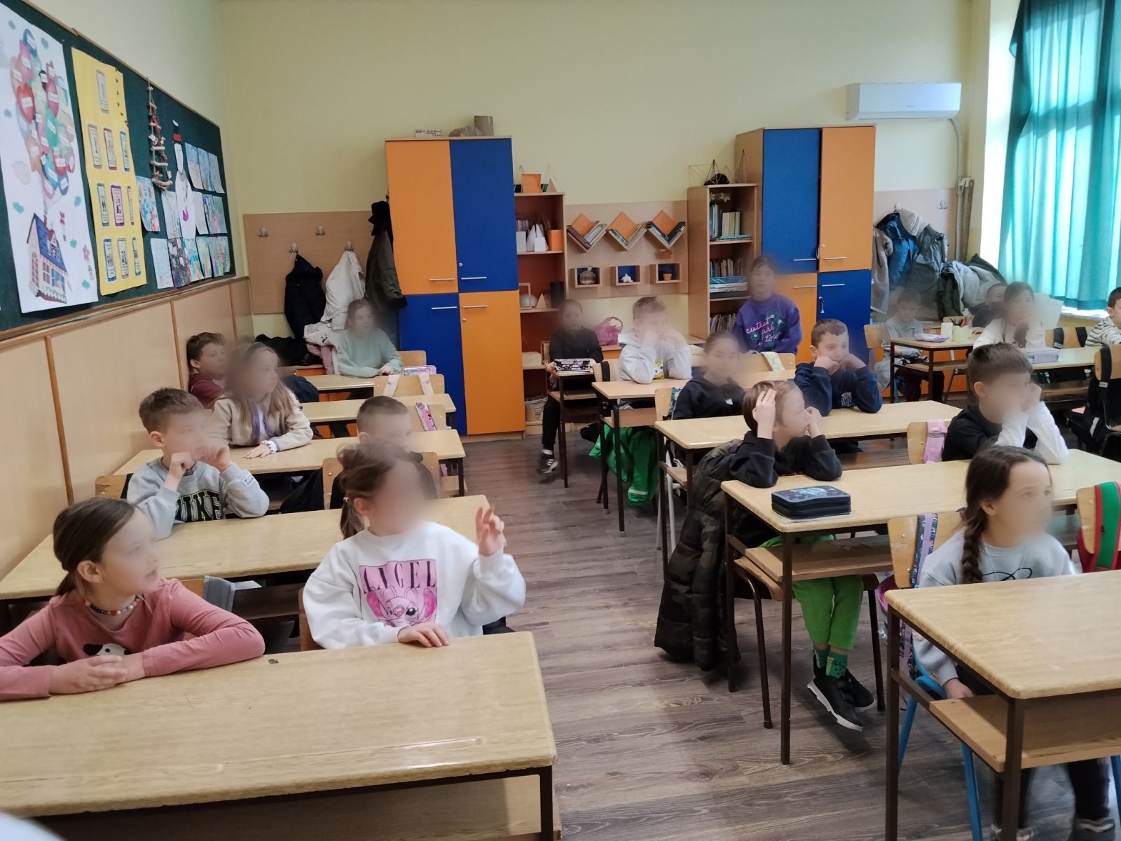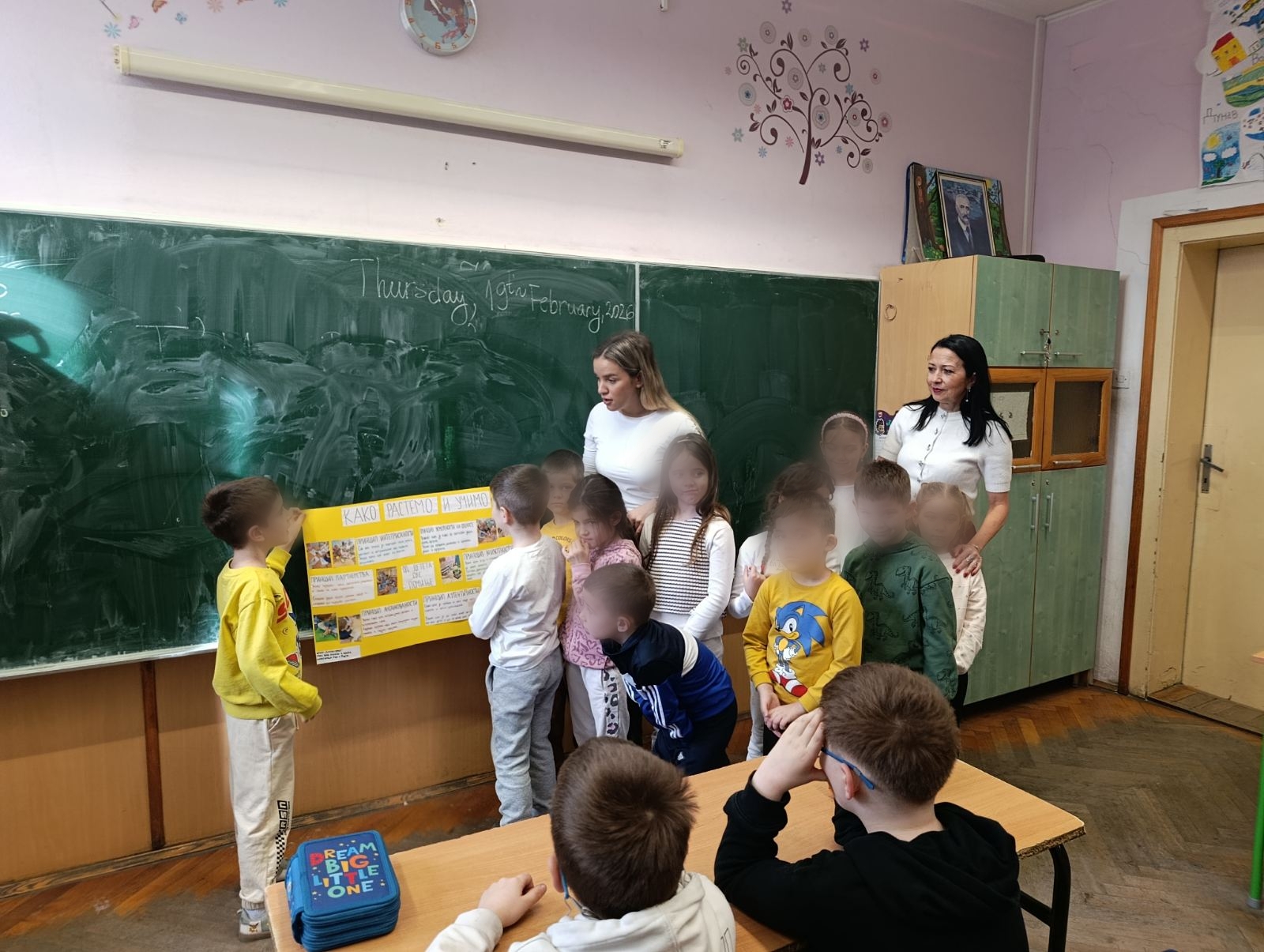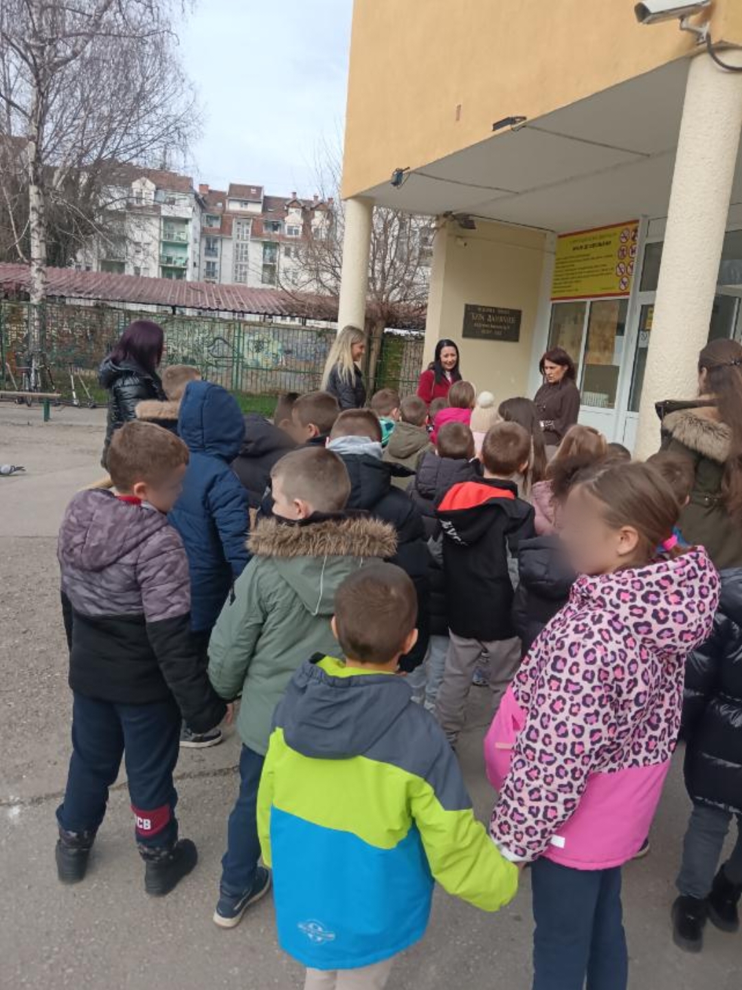 На путу до школе прошли смо поред његове куће а у школу стижемо таман на велики одмор. Дочекао нас је школски педагог и повео у учионице где смо упознали ђаке прваке и њихове учитељице. Ђаци-прваци су за нас осмислили забавне задатке да нам приближе школу и олакшају будуће прве дане у њој. Након тога ми смо њима показали наш пано, како изгледају наши дани и закључили смо да нема баш толико разлике…